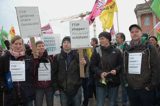 Die Freihandelsabkommen mit Kanada (CETA) und den USA (TTIP) werden weiterhin an Parlamenten und Öffentlichkeit vorbei verhandelt. Daher fordern wir in einem gemeinsam mit dem Bündnis "TTIP unfairhandelbar" initiierten Aufruf die Kandidat/innen für die Wahl zum EU-Parlament am 25. Mai dazu auf, die Ratifizierung dieser Abkommen zu verweigern. Wir sammeln dafür nicht nur auf digitalem Wege Unterschriften, sondern auch auf Straßen und Plätzen, bei Veranstaltungen und Kundgebungen wie die gestrige Energiewende-Demo in Potsdam. Denn: Jetzt zählt jede Stimme gegen den Ausverkauf unserer Demokratie!
