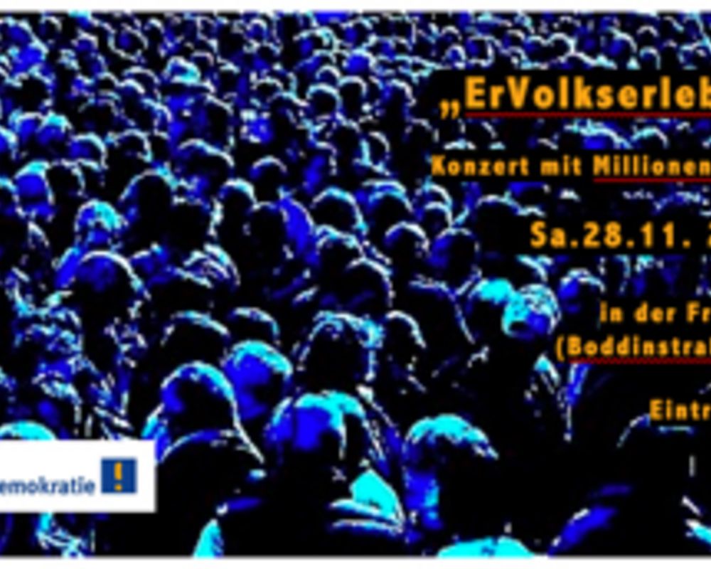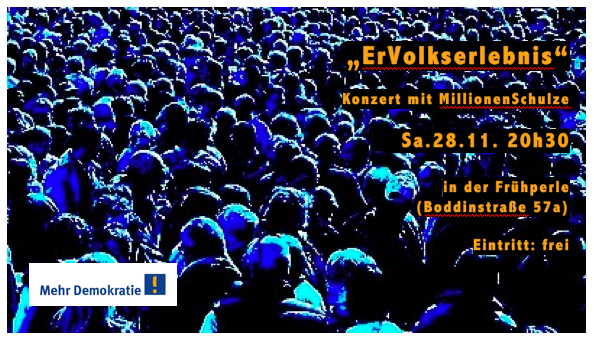 Die „kleinen Leute“ mit ihren Ansichten ernst nehmen – diese Forderung verbindet Detlef Seger und die Initiative Mehr Demokratie, die seit über 20 Jahren für mehr Bürgerbeteiligung und den Ausbau der politischen Mitbestimmungsrechte eintritt. Gemeinsam mit dem MillionenSchulze hat Mehr Demokratie das Konzert „ErVolkserlebnis“ organisiert.
