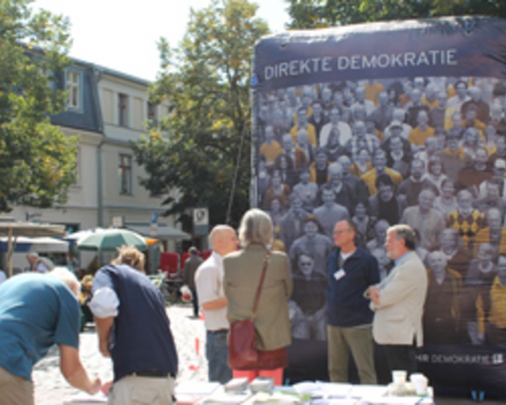 In diesem Rahmen fand auch eine Diskussion mit den Direktkandidierenden vor Ort statt. Alexander Graf von Bülow (FDP), Marie-Luise von Harlem (Grüne) und Klaus-Uwe Grunold (in Vertretung von Anita Tack, Die Linke) sprachen mit uns über unnötige Hürden und Reformbedarf der direkten Demokratie. Grundsätzlich stimmten sie unserem Anliegen zu. Einig war man sich über die Zulassung der freien Unterschriftensammlungen und die Streichung des Haushaltsvorbehalts bei landesweiten Volksbegehren. Zustimmung gab es ebenfalls bei der Zulässigkeit kommunaler Bürgerbegehren über die Bauleitplanung. Über Bebauungspläne dürfen die Bürgerinnen und Bürger zurzeit nicht abstimmen.